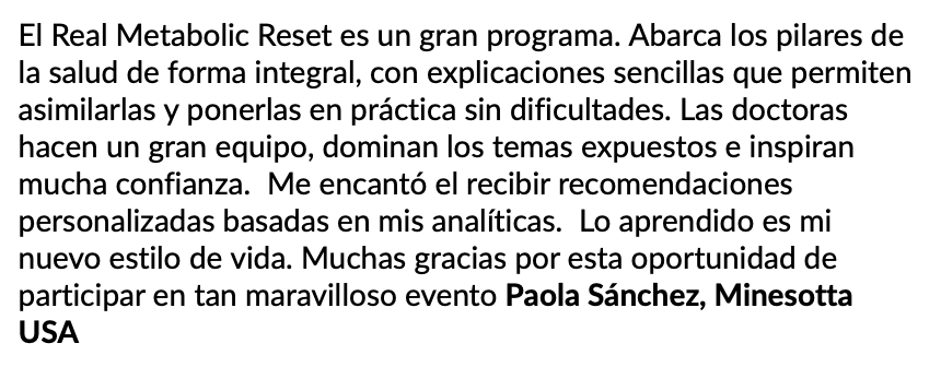 REAL Metabolic Reset es el programa para transformar tu metabolismo de forma segura, sin promesas falsas. Te guiaré junto con mi equipo, tomando en cuenta el origen de tu estancamiento.Si es lo que estás buscando, prepárate para por fin hakear tu metabolismo, balancear tus hormonas y lograr tus objetivos de forma definitiva.